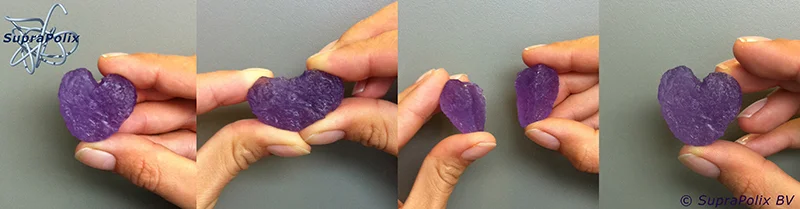 Autonomous healing of a 15 wt% UPy hydrogel: from left to right: initial heart shaped hydrogel, flexibility and elasticity of the hydrogel, the hydrogel cut in two parts, and the hydrogel heart mended by pressing both original halves together.